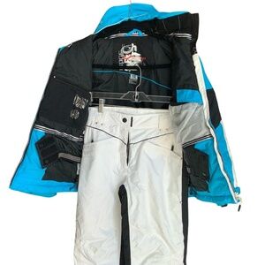 OBERMEYER SKI-JACKET AND SKI-PANT SET SZ: 12 BLUE AND WHITE