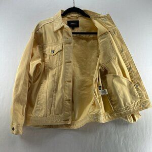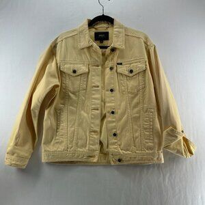OBEY Denim Trucker Jacket Womens S Graphic Rose Button Front Long Sleeve Yellow