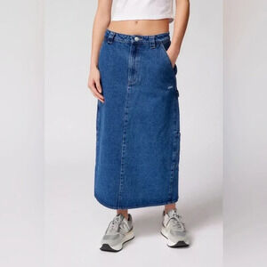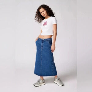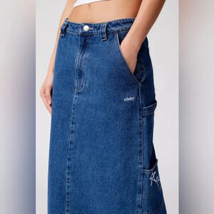 Denim midi skirt from OBEY in a ‘90s-inspired silhouette. Cut with a low-rise and featuring a hammer loop and pockets at the sides plus a split hem at the back. Made special with logo embroidery throughout.