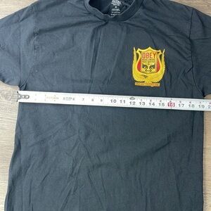 OBEY Mens Black Short Sleeve Tee Shirt, size Medium. In great used conditon. See pictures for measurements and fabric content.