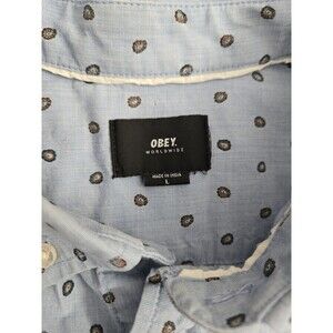 The OBEY Men's Blue and Paisley Allover Print Button Down Short Sleeve Shirt in size L is a stylish and versatile piece for men's casual wear. Made of comfortable cotton fabric with a paisley pattern, this shirt features a collared neckline and button closure for a classic look.