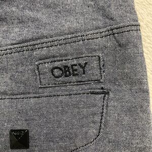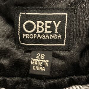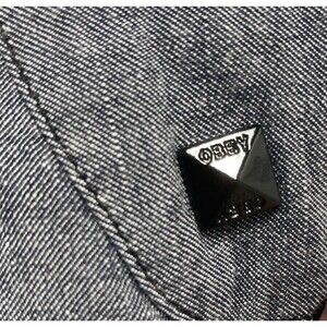 OBEY Propaganda Light Grey Denim Studded Mini Skirt Size 26 Logo Pockets