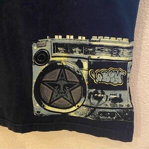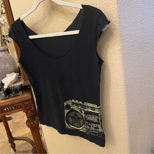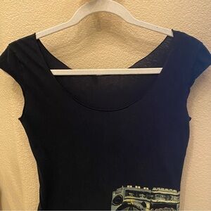 Pre-owned in great condition with no rips or stains. Women or teens black graphic short sleeve top. Y2K style. Made in USA. Comes from smoke pet free home.