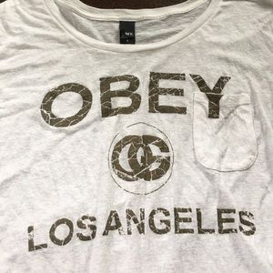 White with gold letting that says OBEY LOS ANGELES. Pocket on the front
