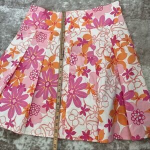 floral A-line skirt, knee-length skirt, pink orange white flower print, retro floral pattern, summer skirt, size small, cotton blend fabric, casual skirt, boho chic, feminine fashion, mid-rise waist, vibrant floral design, spring outfit, flowy skirt, tropical print style
