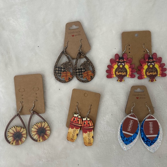 5 pair of gorgeous earrings. Also great for gifts. Bundle includes glittering football earrings, 3 beautiful pair fall earrings, and sunflower earrings. Dangle earrings are from 1 to 2 inches and light weight. Never worn, brand new
