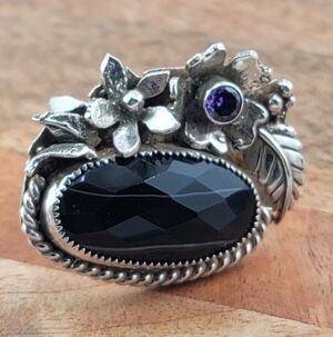 Unique ring garden style genuine Obsidian gemstone and Amethyst crystal handmade in recycle sterling silver metal size 7
