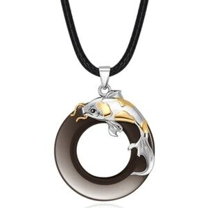 OBSIDIAN Black Hand Carved Silver Koi Fish Pendant Necklace