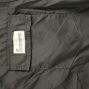 Navy blue Ocean Surf Ltd windbreaker style lightweight jacket. Size Small. Does not say material, but feels like Polyester. Made in USA. A couple small holes on back as in last pic, in great condition otherwise.