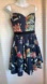 OCHIRLY pleated dress, floral on silky navy fabric, tulle, sheer shoulder. S EUC