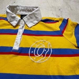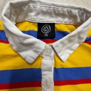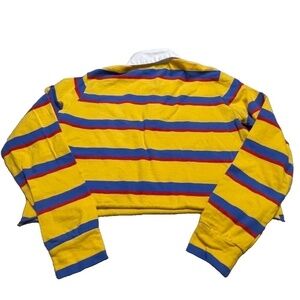 This Odd Future Tyler the Creator Lady's Cropped Long Sleeve Striped Polo in size XS is a must-have for any fashion-forward woman. The vibrant yellow color and bold stripes make it a standout piece in any wardrobe. The polo features a collared neckline, classic/fitted long sleeves, and a cropped style that adds a touch of playfulness to the overall look. Crafted from 100% cotton, this polo is both comfortable and durable. The blue and red stripes add a unique touch that enhances the overall design. Perfect for casual outings or for a night out, this polo is a versatile addition to any wardrobe. Shirt is in good, pre-loved condition. There is one small spot on the sleeve (see last pic).
