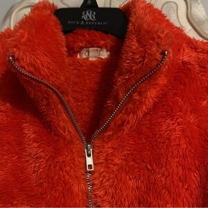 Stay warm and stylish with this vibrant red-orange fleece sweater. Perfect for chilly days, it offers comfort and a pop of color to your wardrobe.