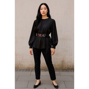 ODDY EMBROIDERED WAIST TIE CUPRO BLEND BLACK WOMEN LONG SLEEVE BLOUSE XL