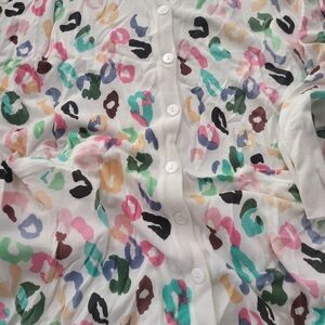 Stylish cardigan with vibrant multicolor pattern. Button-up front. Perfect for layering.