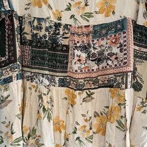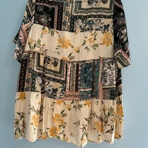 Multi-pattern fall colored short sleeve blouse with scoop neck. 2x