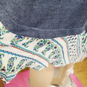 Super cute dress with contrasting fabric ruffle, faux button detail along back withs high low hemline