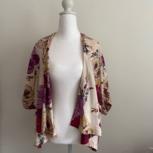 Elegant floral kimono top. Features cream base with purple and pink floral patterns. Lightweight and flowy design. Perfect for layering.