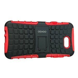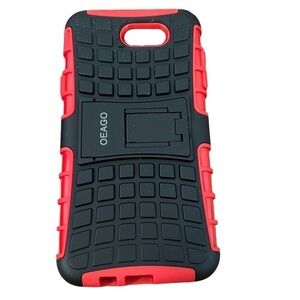 Great condition, brand new. OEAGO. Samsung J7 phone case. Black textured grid detail with red sides. Includes stand. Smoke free home. No trades, offers welcome.