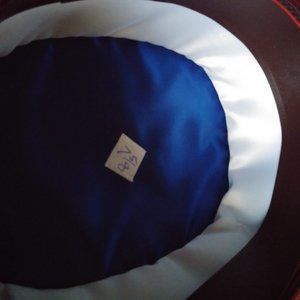 Expertly tailored stiff RED SATIN pillbox cap with 3" amaranth emblem on front.