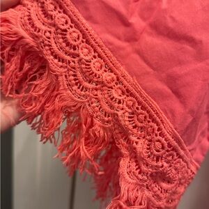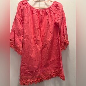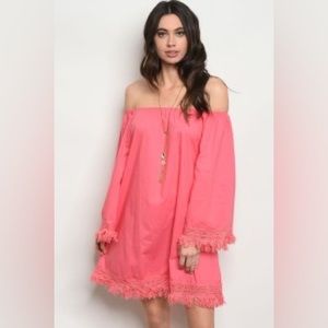 PINK OFF SHOULDER DRESS WITH FRINGE DETAIL ON BOTTOM
