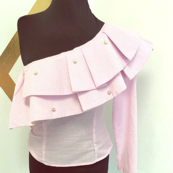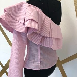 OFF SHOULDER LONG SLEEVE RUFFLE DETAIL STRIPEP