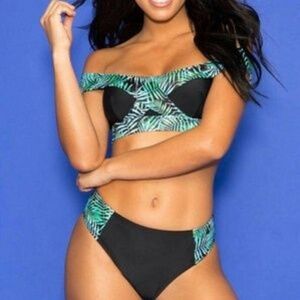 Palm print is all the rage this swimsuit season so grab this unique bikini for your cruise, vacation or day at the poolside! Palm print details on solid black, popular off shoulder style.