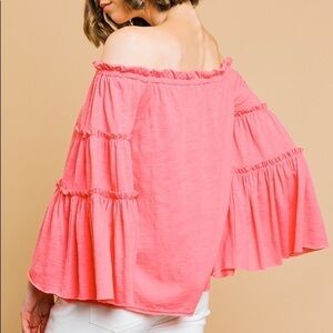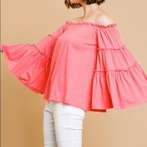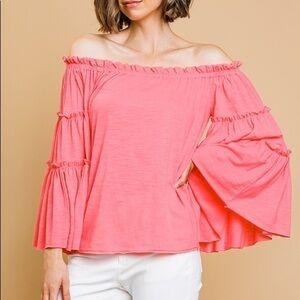 Off Shoulder Oversized Layered Ruffle Bell Sleeve Top with Raw Hem. This top is so cute and comfortable. I own this shirt and get compliments on it all the time.