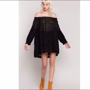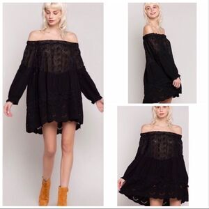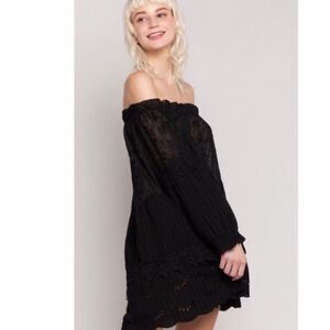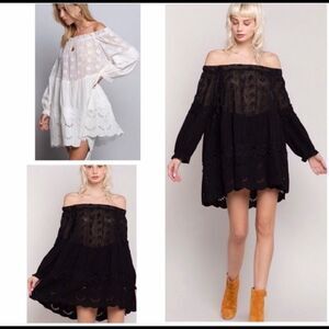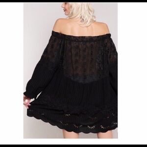 An Adorable Detailed off the Shoulder Tunic Featuring mix fabrication and Lace Trim and finished with 3/4 sleeves wit elastic Ruffle Hem