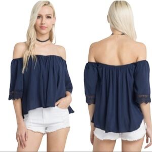 Navy Blue, Off The Shoulder, Flowy Top, Lace Trimmed Sleeves, 100% Rayon. NEW! Boutique item has never been worn.