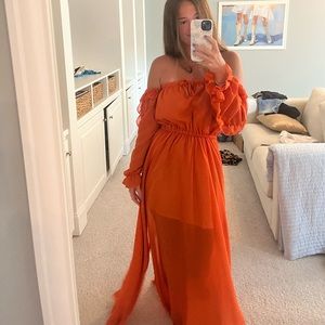 Rusty orange off the shoulder dress with ruffles sleeves!