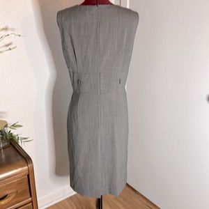 Pleated V neck line, tailored to fit size 8, invisible back zipper, small belt loops with missing belt. Worn.