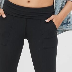 Aerie Offline Low Rise Ribbed Fold Over Flare Black Leggings. Pull on style with a very stretchy, soft, ribbed knit and large front pockets.