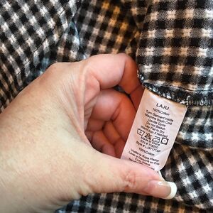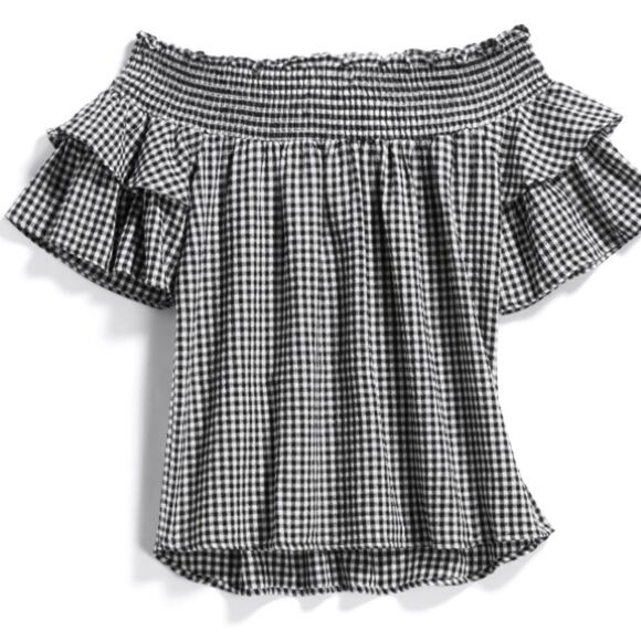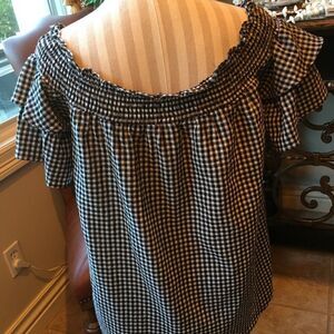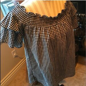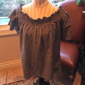 Off the Shoulder or On Janero Checkered Top from Stitch Fix. Laju off the shoulder top. This pattern is adorable on! As is no returns ask Qs!