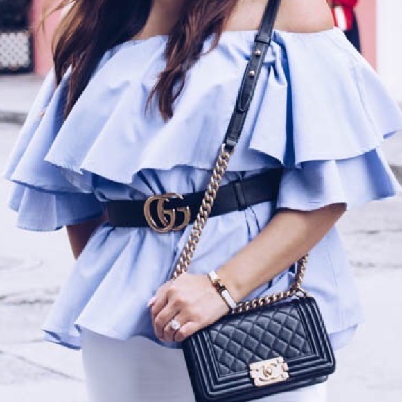 OFF-THE-SHOULDER BLUE RUFFLE TOP BLOUSE