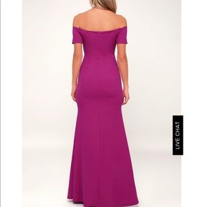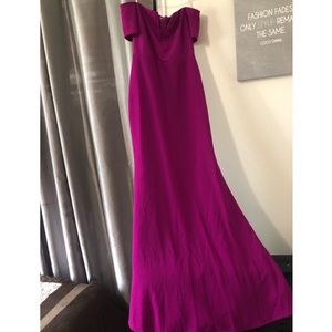 Minimal yet glam. Magenta off-the-shoulder dress. Short, off-the-shoulder sleeves, strapless neckline, and a hidden V-bar. Fitted waist, and a flaring mermaid hem. **NEW/NEVER BEEN WORN**