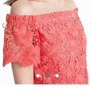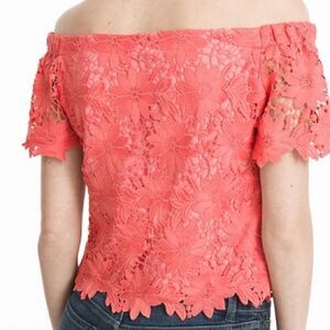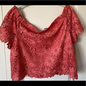 crop top with intricate floral lace and exposed shoulders. This exceptionally beautiful top will transform your favorite pair of jeans from casual to an everyday chic look with a touch of romance.