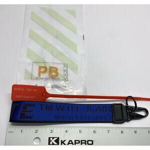 This OFF-WHITE key chain is a versatile accessory that can be used by both men and women. With its detachable clasp, it can be attached to bags or used to hold keys. The key chain comes in an attractive blue and black color scheme and features an industrial clasp that adds to its unique look. The key chain also includes a new zip-tie for added convenience. Whether you're using it for your keys or as a stylish accessory, this OFF-WHITE key chain is a must-have for any fashion-forward individual.
