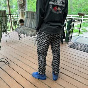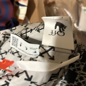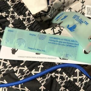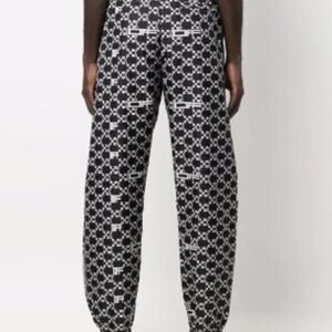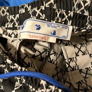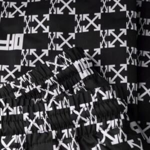 Elasticated waist with internal drawstring, two side pockets, OFF-WHITE all over logo, a flap pocket with zipper on the back, stretched bottom leg