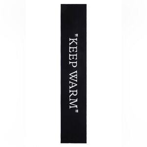 Stylish black scarf featuring bold white 'KEEP WARM' text. Perfect for adding a statement to your outfit.