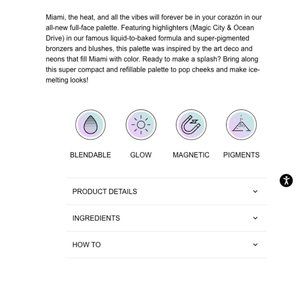 Miami, the heat, and all the vibes will forever be in your corazón in our all-new full-face palette. Featuring highlighters (Magic City & Ocean Drive) in our famous liquid-to-baked formula and super-pigmented bronzers and blushes, this palette was inspired by the art deco and neons that fill Miami with color. Ready to make a splash? Bring along this super compact and refillable palette to pop cheeks and make ice-melting looks!