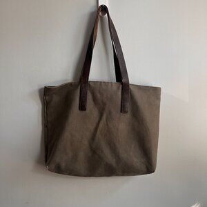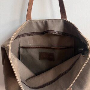 Everlane bag from way back in the day when the quality was super high! Super sturdy grey canvas bag with brown leather handles. One simple interior pocket and zipped top. 17" by 13" with about 2-3" width.