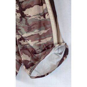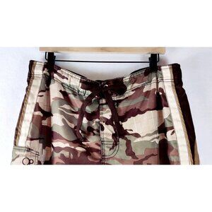OP "Ocean Pacific" swim wear for men in brown camo print. Drawstring, hook and latch fly, drawstring and closable side pocket. White mesh lining. Good condition.