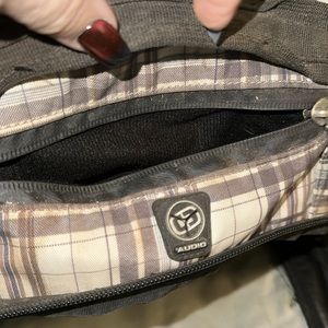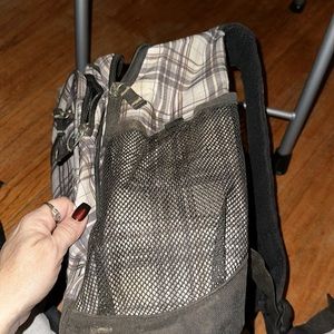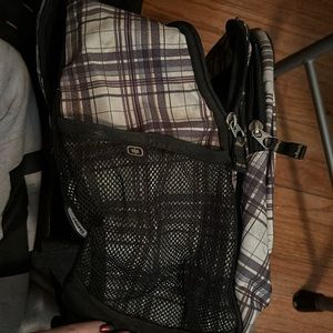 Used during college. Great backpack with a lot of space. White, Brown, and grey Plaid, Audio Pocket, Organizer. Great for carrying books and laptop/tablet.