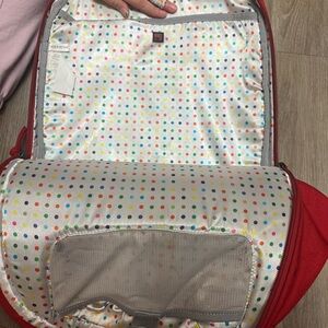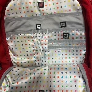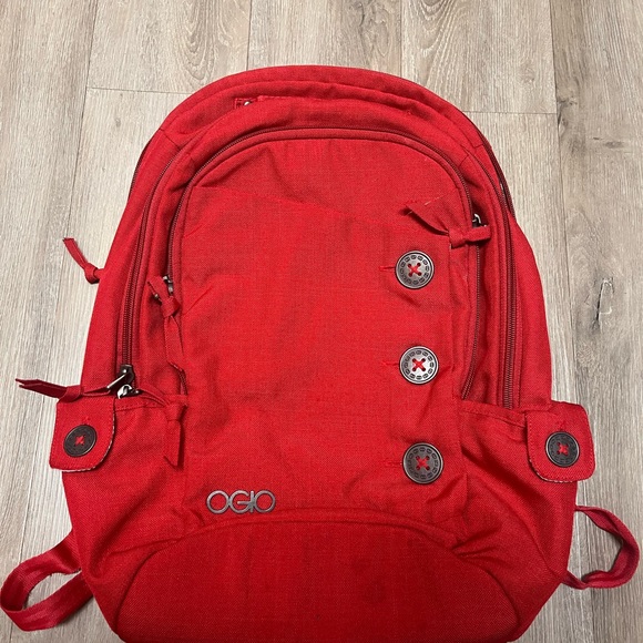 Vibrant red OGIO backpack. Sleek design with multiple compartments. Ideal for daily use.