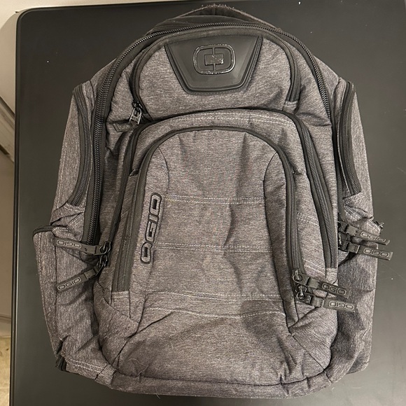 Versatile OGIO backpack in charcoal. Ideal for work and travel. Multiple compartments for organization.