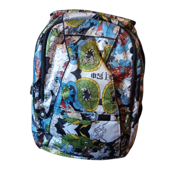Explore your style with this vibrant OGIO backpack featuring a dynamic graphic design with dragon print. Perfect for daily use, this bag combines functionality with a bold look. Minor wear on corners of 1 side, as shown in picture #6. Good used condition. Approximately 16"H x 14"L x 7" W