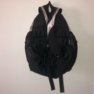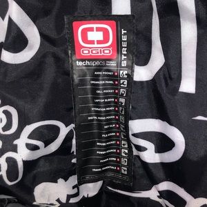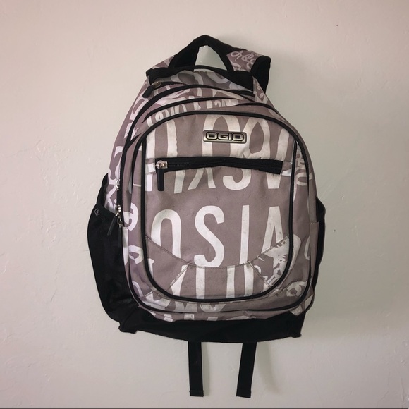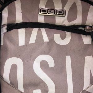 OGIO backpack is white, grey, and black with silver slippers. 4 zipper pockets, 2 side pockets. Used.