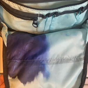 @lmaerz hello! There are a few spots on one side (that I just noticed and so have lowered the price!), and a large blue stain that looks like ink on the inside pocket, but isn’t visible from outside at all. I’ve added photos of both and am open to offers if you are still interested! Thank you for looking!
