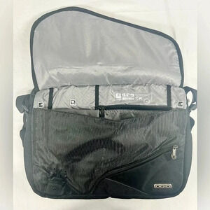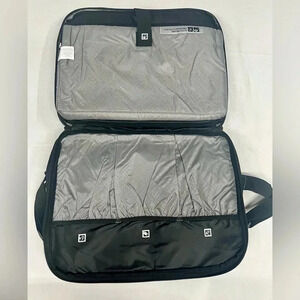 In good condition. No stains or tears noted. Three different compartments for storage and laptop. Dimensions: 18' long x 14" wide