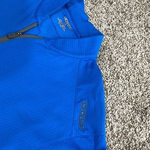 This shirt is made of a thick, but breathable 100% polyester fabric (with a little bit of texture). The blue is a fun cerulean blue-not quite as bright as the pics seem